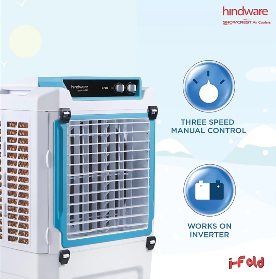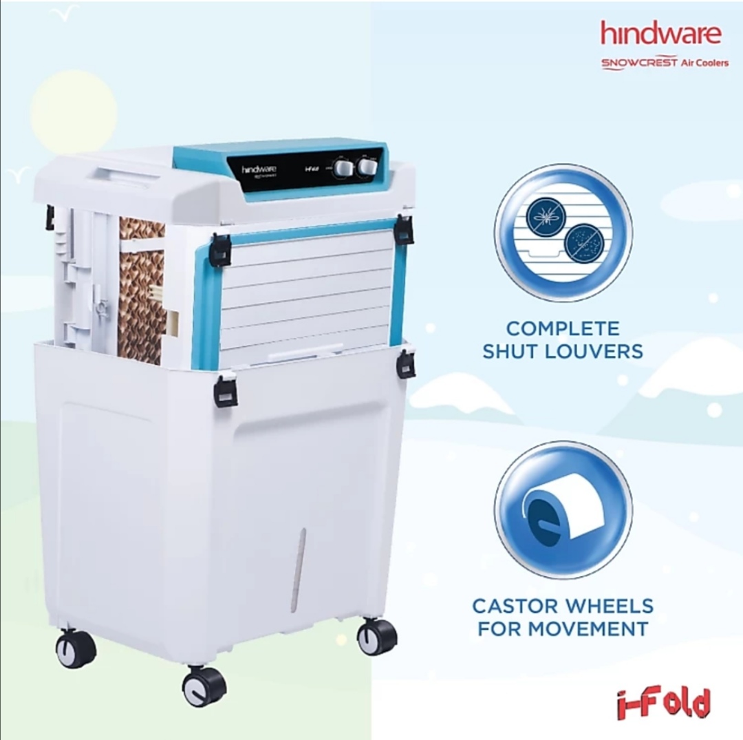 New technology is that new cooler is launch which is Foldable. Features is Air Delivery3400 m³/hr**Air Deflection4 WayAir Throw Distance10 mPower Consumption165 WWater Tank Capacity (Upto Brim)90 LFan / Blower TypeFanSpeed Control3 SpeedWater level IndicatorYesPortability / Castor Wheels support (4)Cooling MediaHoneycombMotorised Louver MovementYes (Vertical)Works on Invertor, Product Dimension (LxBxH) mm560x430x1110 / 650 (Folded)Net Weight13.9 kg, Shut Louvers.