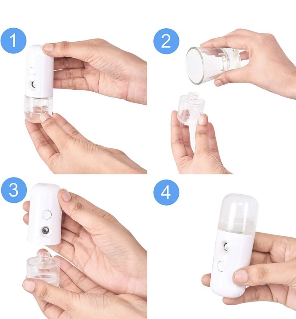 This spray machine can be refilled and recharge, comes with a portable USB cable.Capacity of this machine is about 30ml. Fill 30ml of Alcohol based Sanitizer in it. Make sure machine should be fully charge it before use. Just click the power button and sanitize your valuable.